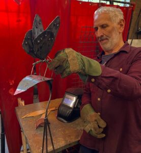 This was our 52nd course and a bonus one we laid on because all the other dates had sold out. Sandra and Michelle, both friends from Holmbridge came to our open studios event for Holmfirth Artweek last July and asked if we could do and extra course, so with Arthur and Nigel joining later we had our full cohort of students. Sandra and Michelle were both in my room and had never welded before but they didn’t let that curb their enthusiasm, full of ideas they launched into making garden sculptures once I’d shown them how to weld. Sandra made a dragonfly, mole head, cat face and a flower made from spoons whereas Michelle made a series of flowers, some Rudbeckia like, others a bit more like poppies. Arthur started out making a hare from steel plate then another version of a hare using steel rod whereas Nigel made a couple of pieces inspired by his love of cycling and then a dished bowl from a piece of steel plate. The weather was lovely all weekend so we sat outside on the picnic benches at dinnertimes and enjoyed a break from all the activity. As I said earlier all this years dates are sold out but we sometimes get cancellations so if you want to go on our waiting list just drop me an email.