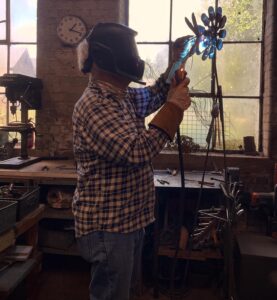 Boom and there goes another course, two more left for this year then we’ll take a break while it’s chilly in the mill and start again next March when it’s hopefully a bit warmer. It goes without saying – a big thank you to my good friend and fellow host Billy aka David Mayne who I run the courses with and if you want next year’s dates before they get generally released just drop me and email. So, back to course number 58 and Billy had Greg and Ali in his room across the corridor. Greg had previously bought work from Billy and so had decided to have a go himself, after mastering the welding he was on a roll and made six pieces of work, admittedly some of them were quite small but it might just be a course record. Ali was bought a place on the course as a Christmas present and brought a collection of victorian bottles with her. She made a flower inspired display stand for them to go on in her garden. In my room were good friends Jane and Hilary who’d travelled up from near Banbury. I’d mentioned the courses to Hilary when I met her at Staithes last year so she decided to see wether it was actually possible to make a piece in a weekend. Jane got to grips with the welding and made a balancing bird for her garden from old fire extinguishers and threaded bar. Hilary made a dog for her garden once she’d got to grips with not being able to see much through the welding masks. It’s always great to see our students surprise themselves with their capabilities (and a bit of help from us) so if you fancy having a go next year just drop me an email.