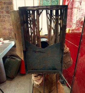 Course number 59 completed and the last but one of the year and thanks as ever to Professor Billy aka David Mayne who runs the courses with me. It was a fairly easy going one to be honest, we had three returning students and a new one who is very creative anyway so everyone seemed to know what they were doing pretty much. First up in my room was Ilona who’d travelled down from Cumbria and wanted to make some kind of diorama looking piece which she could slot one of her stained glass panels into the back of. Once she’d mastered plasma cutting and we’d found an old metal trunk to house everything in she was away. I also had Craig, an ex aerospace engineer who first came on our course last year and brought a scale maquette made from cardboard based on turbine blades which he immediately set about scaling up and welding together. In Billy’s room were Steven and Steve who’ve both been numerous times before so they set about working through the junk materials we had in stock and made owls, butterflies, flowers and obelisks. They’d probably have made more pieces between them if it hadn’t been for the fact that Steven had to go early for a concert and Steve kept welding things in the wrong place and had to keep altering them. We’ve got one more course for this year then we’ll look at sorting next year’s dates out. If you want to receive them before they go on general release just drop me an email.