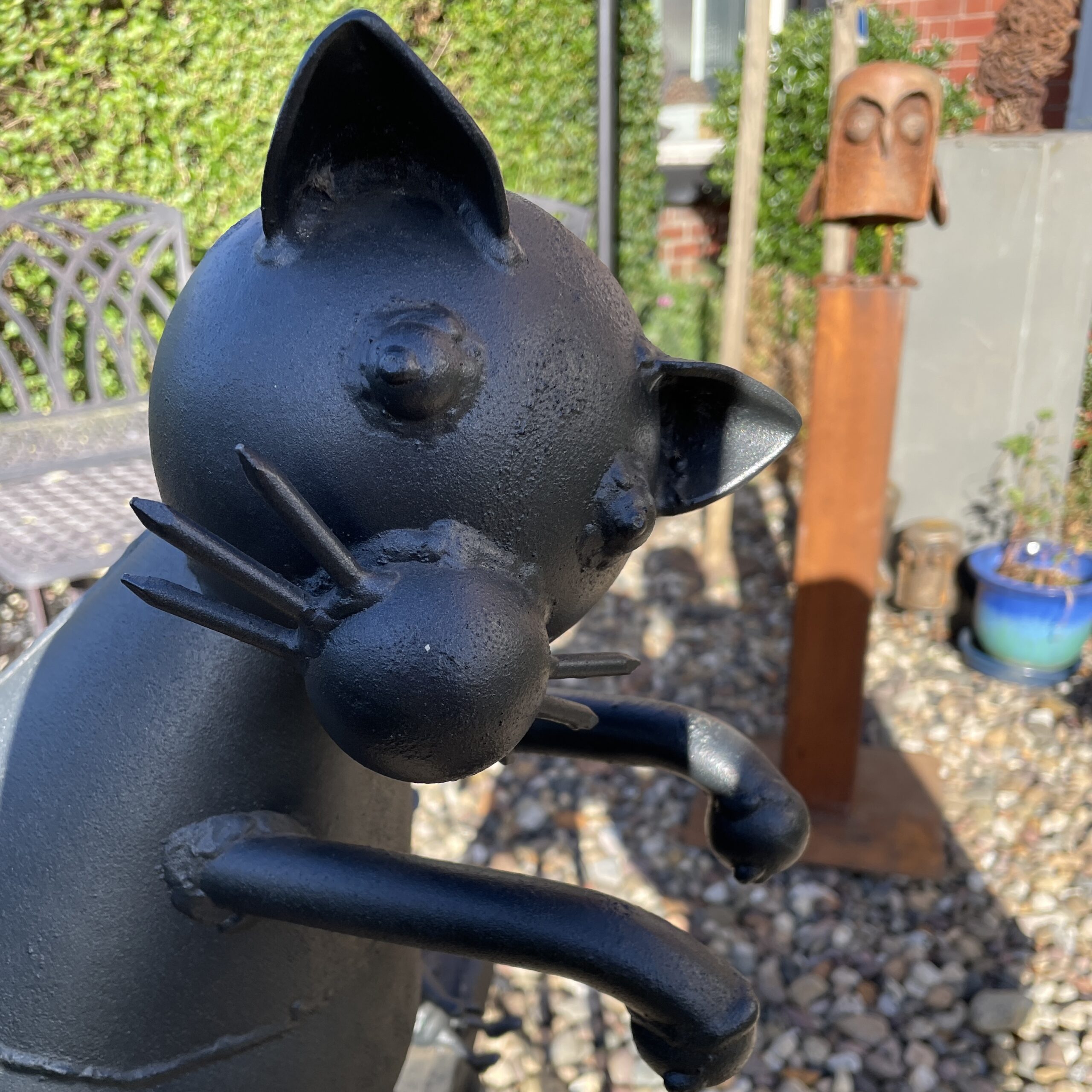 We’ve just run our 56th course and four happy students surprised themselves with their abilities creating some great pieces of sculpture. It’s an introduction to metal sculpture course so once we’ve covered the basics and shown you how to weld, you’re off and we keep an eye on you until you’ve made at least one piece to take home with you. David Mayne and I run the course with only four students at a time so you get as much guidance and input from us as you need. So this time round we had three new students and one who’d come back for her third time. In my room were the girls, Helen and Laura. Helen just needed a refresher as it was her third time then she was off making giant flowers for her garden from twisted cutlery and rebar. Laura borrowed one of my face moulds and made two heads, one from nuts and the other from ball bearings, definitely a change from her usual root canal work as a dentist. In Billy’s room across the corridor were Chris and Stu. Chris had ideas about making a cat and so it was just a question of deciding which were the right components and fitting them all together. The cat became quite elaborate so now it’ll be an outdoor cat after it’s been galvanised. Stu was bought a place on the course as a Christmas present so had had time to come up with the idea of some brushes and a dragonfly. Being a structural engineer, he did have to compromise on structural integrity a bit in favour of aesthetics but it was a lovely piece of sculpture in the end. We’re full up on course places this year despite slotting and extra two courses in so if you want next year’s dates before they’re released just drop me an email.