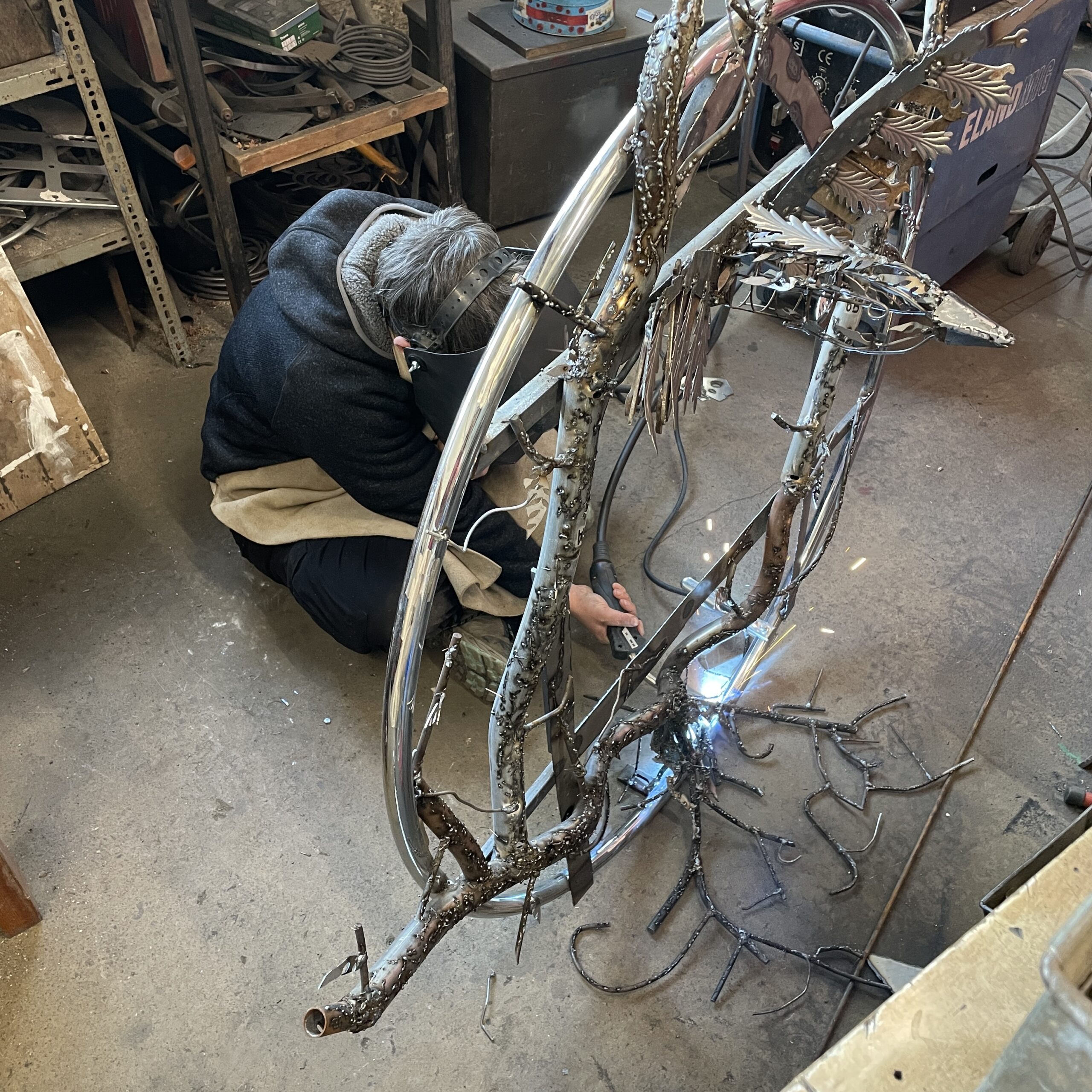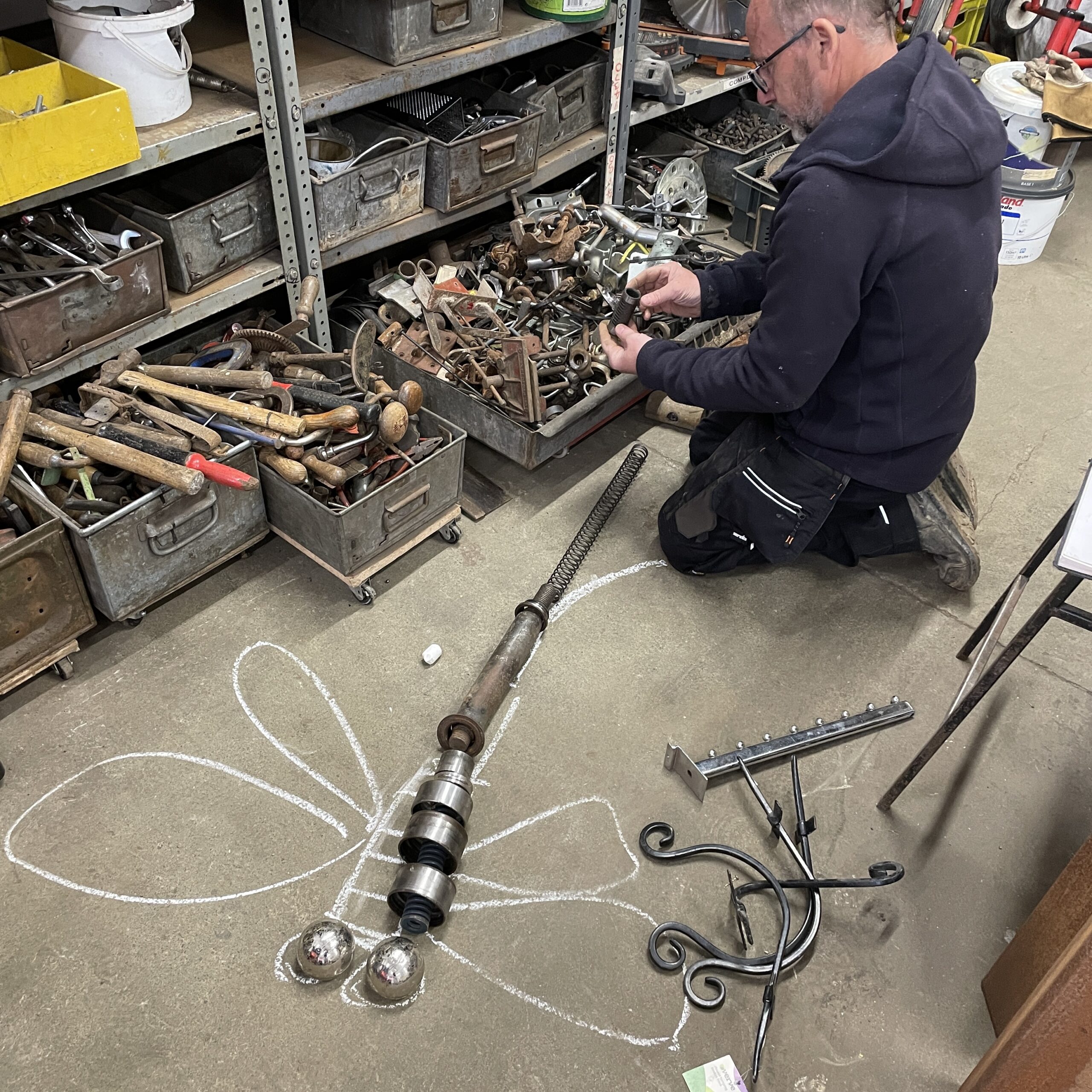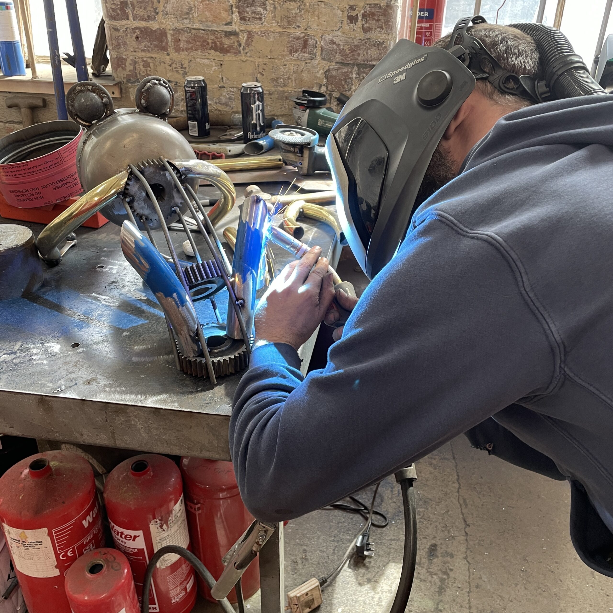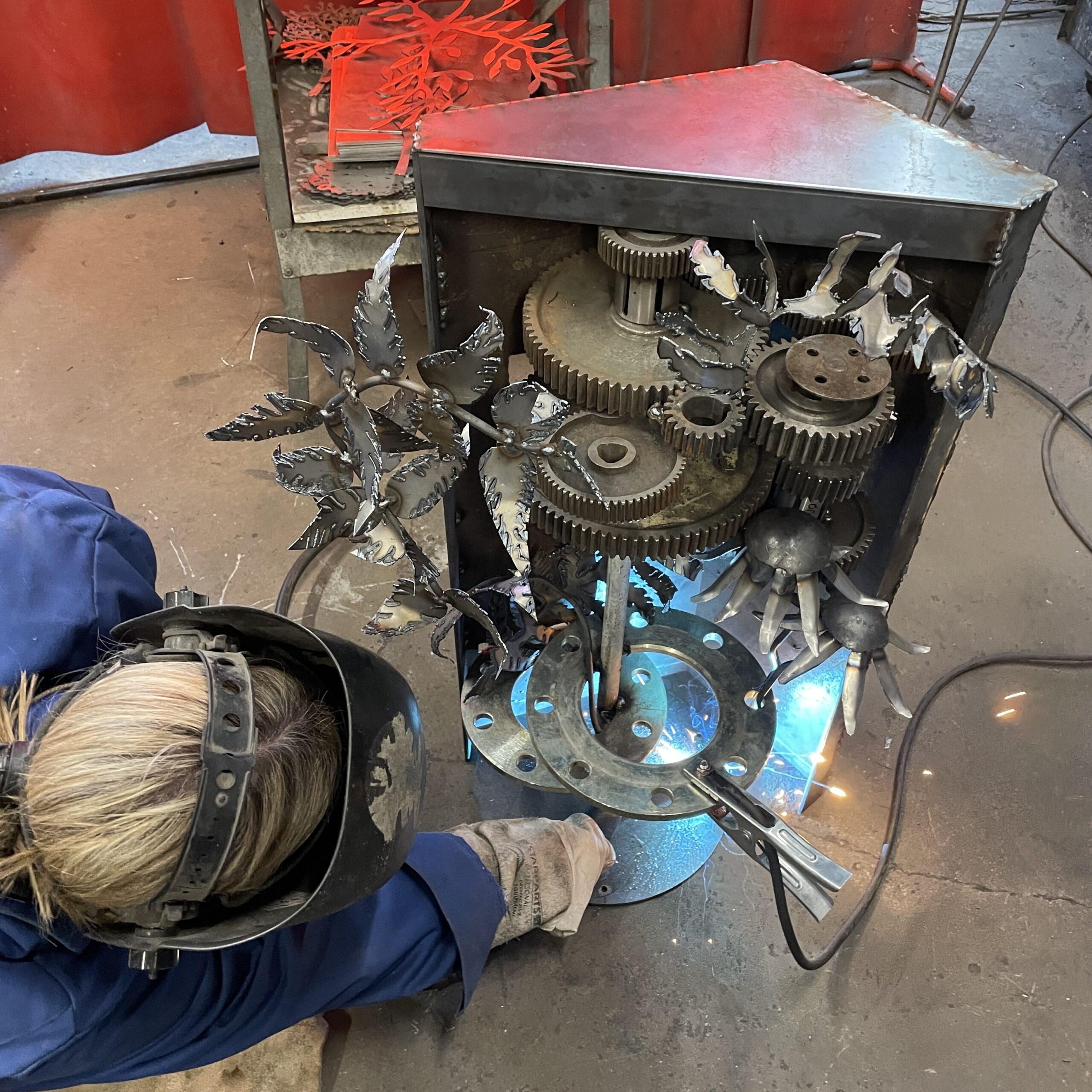We’ve just had to sneak another course in due to our inexplicable popularity and this one was a weekday one for a change. We had father and son, Dave and Jake in my room and good friends Alex and Cassie in Billy’s room. Dave wanted to make a big dragonfly to sit at the side of his pond so once he’d mastered the welding he chose a selection of junk pieces to make it from and got to work. Jake had welded before, being an engineer so he collected all the bits from my scrap pile he thought were frog like and a few bits he brought in too then set about methodically fixing them together. Alex being a multi-media and glass artist knew exactly what she wanted to make – an organic frame to hold a stained glass window panel with a bird bursting through it! I don’t think she stopped working for more than ten minutes over the whole two days. Finally, Cassie had seen some abstract relief blocks in an exhibition and wanted to make her own version of them for her garden. This seemed to involve finding the heaviest cogs and other pieces of steel we had and welding them all together, making it somewhat heavy to move. It was definitely a unique piece of garden sculpture and that’s what we liked about it. In fact all four pieces were great to see evolve from initial idea through to finished piece over the two days. I run the courses with Billy (David Mayne) from our workshops at Sculpture Lounge in Holmbridge. If you fancy having a go we’ve got just 3 places left for this year so do get in touch asap.